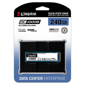 Le disque DC1000B pour datacenters de Kingston est un SSD hautes performances M.2 2280 PCIe NVMe qui utilise l'interface PCI-Express 3.0 x4. Le SSD DC1000B embarque par alleurs de la mémoire NAND TLC 3D sur 64 couches. Il montrera tout son potentiel en disque de démarrage pour serveur.