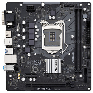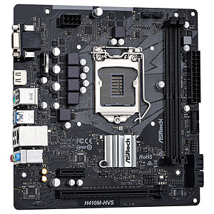 La carte mère ASRock H410M-HVS 2.0 est conçue pour accueillir les processeurs Intel de 10ème génération Comet Lake-S sur socket LGA 1200. Elle permettra l'assemblage d'une configuration polyvalente et efficace capable de s'acquitter de toutes les tâches. Elle prend en charge la RAM DDR4, les cartes graphiques PCI-Express 3.0 16x, les disques SATA 6 Gb/s et les périphériques USB 3.0. Plus accessible que les jeux de composants Intel H470 et B460 Express, le chipset Intel H410 Express offre un très bon rapport performances / prix pour l'informatique de base (bureautique, Internet, multimédia et PC gaming entrée de gamme).